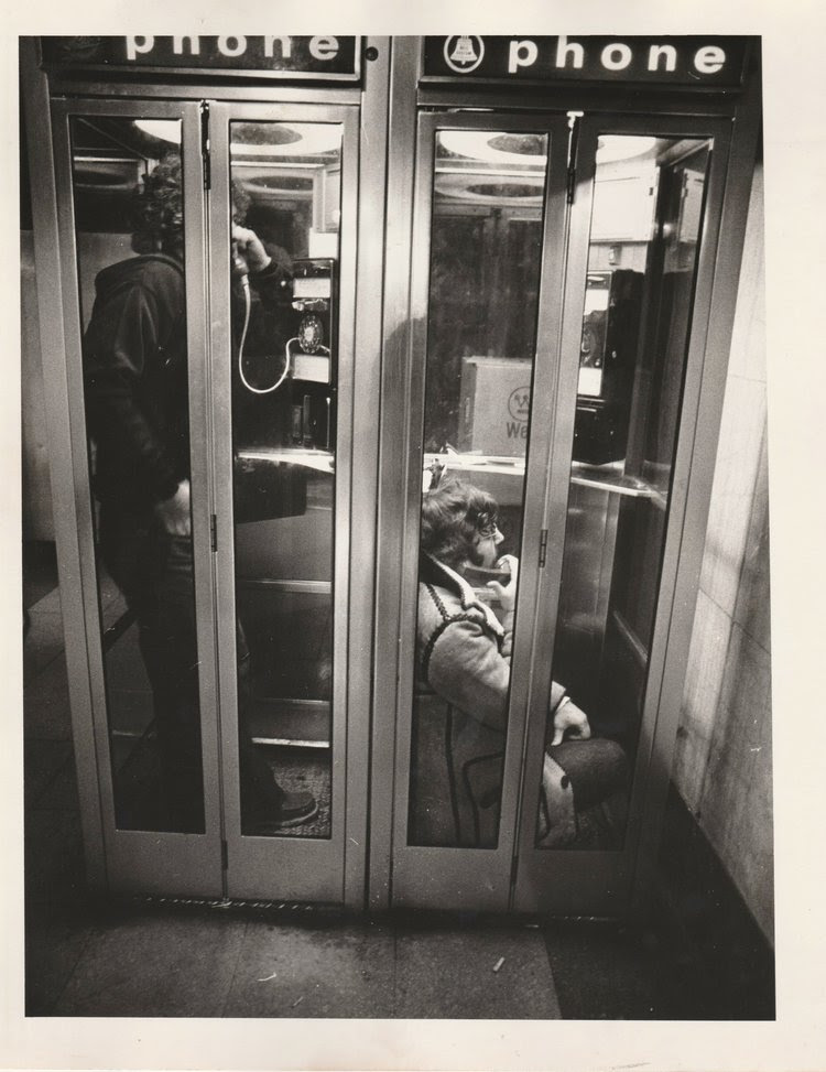 Bob Dylan and Louie Kemp in adjoining phone booths on the road during the Rolling Thunder Tour, 1975. Photo courtesy of Louie Kemp.
