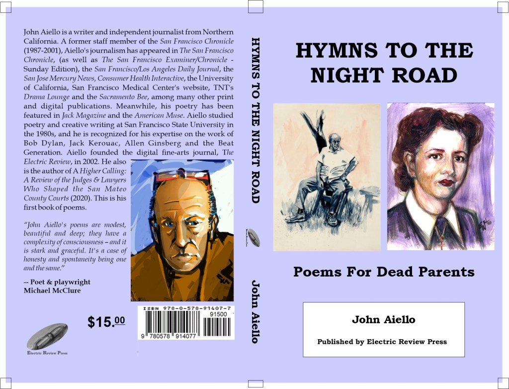 John Aiello and Electric Review Press announce the release of Hymns To the Night Road (Poems For Dead Parents) in paperback. The book, Aiello’s first collection of poems, is comprised of 53 poems and one essay written over the span of 30 years, with the pieces examining the aftermath of each of his parents’ deaths. Part elegiac remembrance part journalistic reportage, the book is thematically influenced by both Allen Ginsberg’s Kaddish and the classic Tibetan Book of the Dead. Hymns To The Night Road is introduced by a statement from Ginsberg’s biographer Michael Schumacher, who edited several volumes of the seminal Beat poet’s journals for the University of Minnesota Press following Ginsberg’s death in 1997.